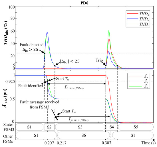 Then, when the peak in the THDs eventually disappears, the FSM moves to state S3 (Fault Monitoring), where it systematically monitors the fault with the intention of isolating only permanent faults and avoiding undesirable tripping. It is worth noting that temporary faults are typically resolved within 100 ms without requiring any protective action [40,41]. Therefore, during state S3, the timer keeps running, and once it reaches the maximum limit of 100 ms, the FSM moves to state S4 (Fault Isolation), which is intended for tripping the nearest circuit breaker and isolating the fault.