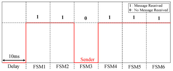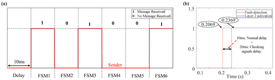 When the FSM of the faulted DL moves into state S2, a timer called begins running to track the fault duration. Additionally, a new fault signal is dispatched to the remaining FSMs, informing them of the event and enabling them to stop their processes. The transmission delay for this fault message, referred to as , is estimated to be approximately 10 ms [38].