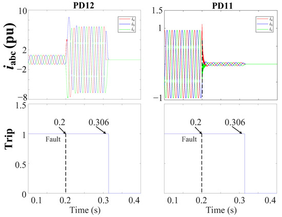 The detection algorithm identifies the fault within approximately 6.8 ms. Subsequently, the fault location algorithm is promptly engaged to isolate the fault. Figure 33 depicts the PSV profile of each PD in response to the grid configuration change. PD14, located at bus 11, exhibits the lowest PSV value at 0.19 pu. Following Figure 13a, PD14 will execute a trip operation at 0.11 s from the fault initiation, precisely at 0.31 s. Figure 34 shows the grid currents, , and trip signals. The simulation results show the adaptability of the protection strategy in response to the grid configuration changes.