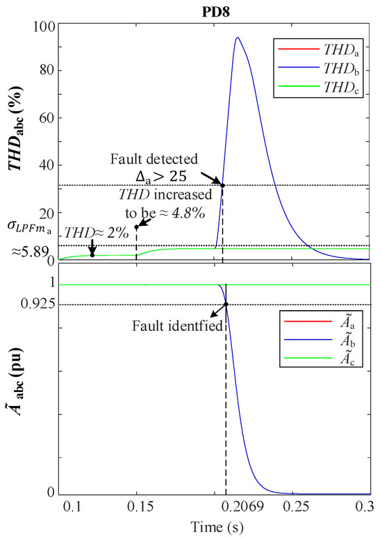 An example of and behavior during a fault of phase “c” using the proposed THD-LPF fault detection approach.