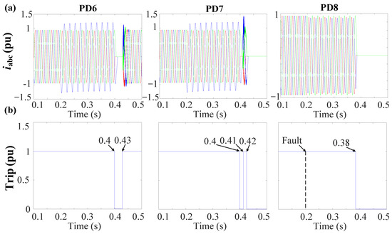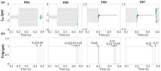 Behaviour of the system during the 3PH fault at D7 in the case of grid reconfiguration. (a) Grid currents (). (b) Trip signals.
