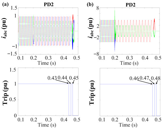Grid currents () and the trip signal during the 2PH fault at DL1 for various fault resistances. (a) r = 0.1 Ω. (b) r = 5 Ω.