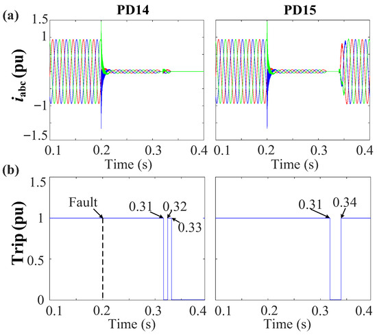 Following this, the sequence components are measured, and the sequence-based fault location layer is employed to precisely locate and isolate the fault, using the behavior of the NSV due to the fault’s unsymmetrical nature. The NSV profile of the system during the fault depicts that the bus situated at the terminal of the faulted line (DL1) and connected to PD2 and PD3 exhibits the highest NSV value of 0.82 pu. With reference to the definite time–voltage curve outlined in Figure 13b and employing a procedure akin to that in Figure 11, it can be observed that PD8 necessitates approximately 0.15 s from the time of fault occurrence to initiate the tripping signal.