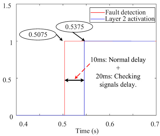 In Figure 36, the first layer is activated automatically, detecting the fault in 7.5 ms. Due to communication issues, a given delay is introduced for checking and confirming the failure. Subsequently, Layer 2 is engaged to isolate the fault.