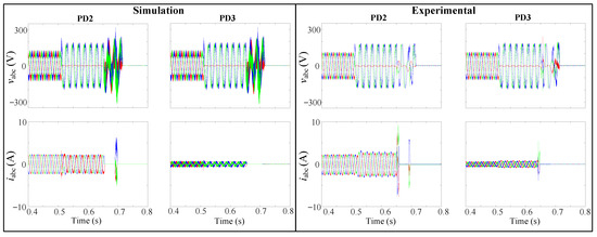 Figure 37 illustrates the simulation and the experimental behavior of the grid voltages, , grid currents, , and the corresponding tripping signals during the occurrence of the 1PH-G fault, respectively. As seen in Figure 37, both PD2 initiates tripping simultaneously at 0.65 s.