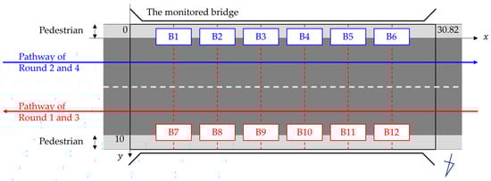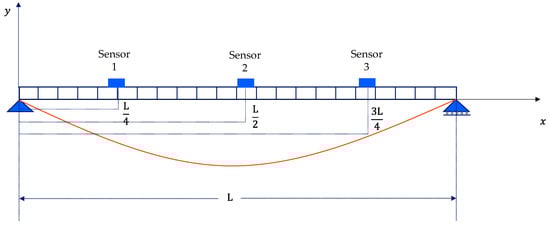 where is the measurement point on the bridge (-th sensor’s location), and is the bridge span length. In this formula, indicates the entrance of the bridge. This process assumes that the bridge mode shapes are sine curves.