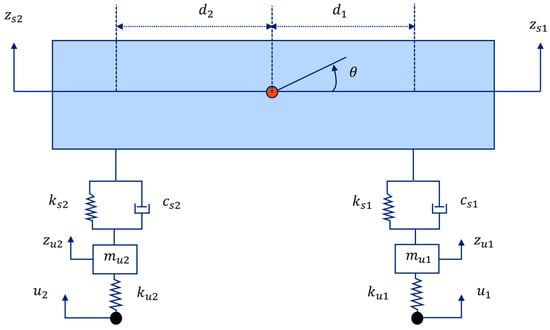 The vehicle model used in this study is a half-car model Figure 2. In this model, , are the front and rear sprung-mass vertical accelerations, respectively; , are the front and rear spring stiffness coefficients; , are the front and rear damping coefficients; , are the front and rear unsprung stiffness coefficients; , are the front and rear axle input profiles; and is the pitch angle of the vehicle body. The equation of motion of this vehicle model can be written as follows:
