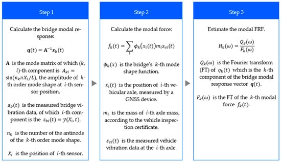 The proposed method procedure is described in the following diagram. After the acceleration data for both the bridge and vehicle system are obtained, the bridge modal response and modal contact force are calculated from the formulae given in the diagram Figure 3 and then the modal FRF is estimated as the ratio of modal response to modal contact force in the frequency domain.