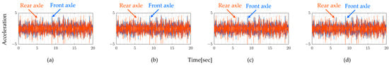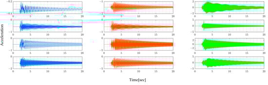 Figure 4 shows the numerically simulated vibration data of the vehicle’s sprung mass and . According to this figure, it is observed that the sprung-mass accelerations remain unchanged, even when the bridge model is altered. This phenomenon can be attributed to the dominance of road profiles affecting vehicle vibrations. In this simulation, the same road unevenness is assumed throughout.