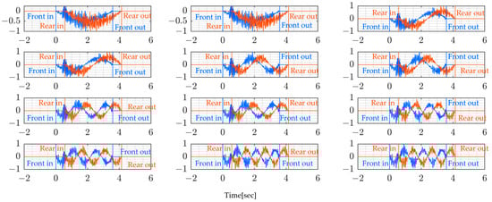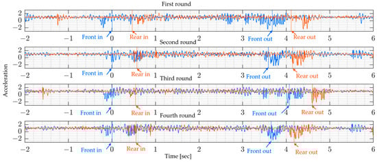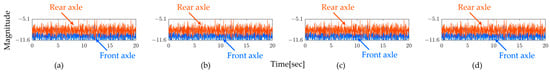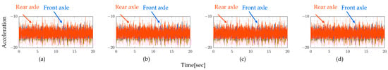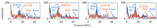 The sampling rate of the sensor used is . The following figures present the measurement signals which show 1 G (gravitational acceleration) data upward shift due to the sensor settings. Figure 13 shows the vehicle’s measured vertical acceleration for the front and rear axle, and Figure 14 shows the frequency content of the measured vehicle’s vertical acceleration of all four rounds for 6 s duration.