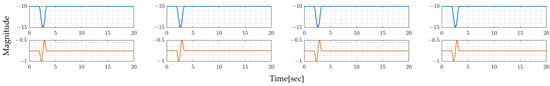 where are the random phase angles, is the angular spatial frequency, and is the power spectral density of the road unevenness. The input profile is given by the following formula [30]: