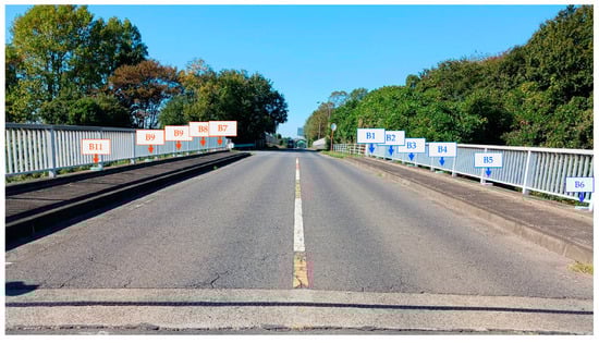 In a Vehicle–Bridge Interaction (VBI) system [20], the input can be considered as vehicle vibrations, and the output as bridge vibrations. Nevertheless, to adopt FRF-based strategies for bridge inspections, it is necessary to establish identification strategies that take into account the motion of traffic loads. Furthermore, the development of reliable methods for time synchronization between separate measurement systems installed on vehicles and bridges is essential. This approach has the potential to enhance the accuracy and applicability of SHM in evaluating the structural health of bridges under real-world conditions.