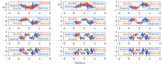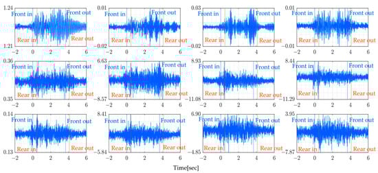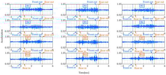 The added red and blue lines indicate when the vehicle enters and leaves the bridge span. This is made possible using GNSS devices mounted on the vehicle. In this figure, the bridge vibration shows a similar trend at all measured points, which suggests that it is not possible to identify bridge vibration characteristics by simply looking at acceleration signals.