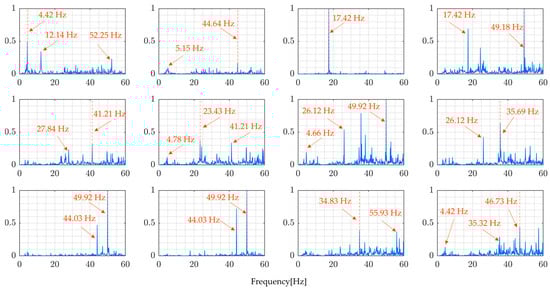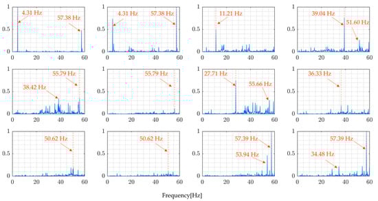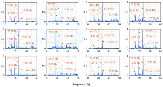 The following Figure 9 shows the FRFs estimated by numerical experiments obtained by directly calculating the ratio of Fourier transforms of vehicle and bridge responses, while Figure 10 presents the modal FRFs obtained from the proposed method; the red vertical dashed line indicates where the bridge’s natural frequency is expected to be found.