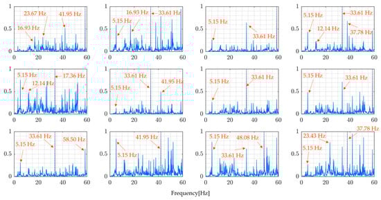 From Table 4, it is evident that the dominant frequencies of the sprung vibration do not coincide with the natural frequencies of the bridge. Additionally, different peaks are observed for the front and rear wheels. This suggests that identifying the natural frequencies of the bridge from the vehicle’s sprung vibrations is challenging. The variations in vibration frequencies between the front and rear wheels further complicate this task, indicating that the vehicle’s response does not straightforwardly reflect the bridge’s natural frequencies. This finding underscores the complexity of extracting bridge characteristics from vehicle vibrations within the VBI system.