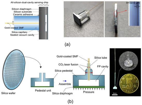 Though a 125 μm diameter sensor based on a Pyrex glass cavity can be achieved; the mismatch of the thermal expansion coefficients of Pyrex glass and a silicon diaphragm tends to introduce internal stresses, thus affecting the performance of the device. In addition, due to the low softening temperature of Pyrex glass, the anodic-bonded Pyrex glass–silicon structure cannot work properly when the temperature is above 350 °C; thus the devices are difficult to apply in extreme environments with high temperatures. Therefore, the researchers have developed an all-silicon FP cavity processing process, where the cavity and diaphragm are prepared by a mask etching and high-temperature wafer bonding process. Wang et al. [48] demonstrated an all-silicon dual-cavity fiber-optic pressure sensor based on direct bonding in 2021, as illustrated in Figure 3a. The presented sensor can survive under high temperatures up to 700 °C. In addition, the silicon layer of the substrate can be used as a solid FP for temperature compensation. Some researchers have also utilized silica wafers instead of glass and silicon, which are still processed based on the MEMS lithography process to improve the device’s working temperature. Li et al. [49] presented a sensor working up to 800 °C in 2022, which was fabricated by silica wafer high-temperature direct bonding technology, as shown in Figure 3b.