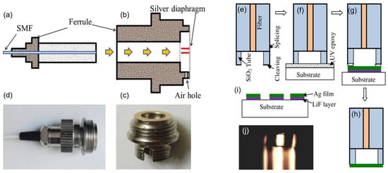 (a–d) Schematic and photo of thick silver diaphragm-based fiber-optic press sensor. A standard physical contact type of fiber optic connector (a) is screwed into the sensor head (b,c) till the dashed line and then the sensor (d) is fabricated. There is an air hole on the sensor head in order to keep the balance of internal and external pressure (reprinted with permission from Ref. [60] © Elsevier, 2017); (e–j) schematic and photo of thin silver diaphragm (diameter of sensor is 125 μm). Sensor fabrication process (e–h), silver thin film deposited on a glass substrate (i), and an optical microscope picture (j) of a typical sensor fabricated (reprinted with permission from Ref. [61] © Optical Society of America).