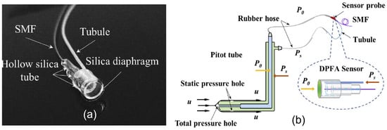 (a) Photograph of a DPFA sensor based on FP interferometry. It consists of a standard SMF, fused-silica diaphragm-based FP interferometer, and a plastic tubule; (b) schematic diagram of the sensor connected to a Pitot tube for differential pressure measurement. u is the airflow velocity, P0 is total pressure in the airflow, Ps is static pressure in the airflow (reprinted with permission from Ref. [77] © Optical Society of America).