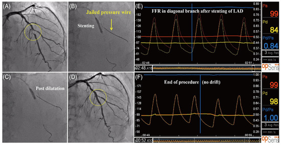 (A) Coronary angiography shows a stenotic lesion in the middle of the LAD; (B) a stent was deployed with the jailed-pressure wire technique using a durable fiber-optic FP pressure wire; (C) post-stenting dilatation was performed using a non-compliant balloon; (D,E) even though the angiographical stenosis was greater than 50%, additional FKBD was deferred based on the FFR value of 0.84; (F) the pressure wire was successfully retracted with slight resistance, and drift phenomenon was not observed. FKBD, final kissing balloon dilatation; FFR, fractional flow reserve; LAD, left anterior descending artery (reprinted with permission from Ref. [86] © Wiley, 2019).