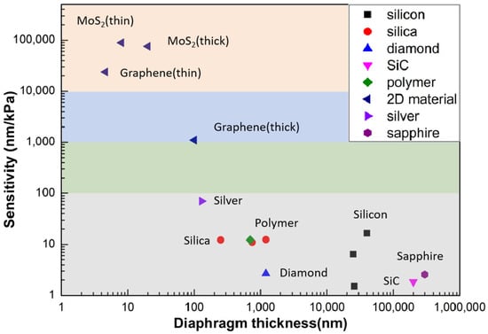 Comparison of the sensitivity of different diaphragm materials (data sources: MoS2 films [75], graphene film [70,72], silver film [62], silica film [34,37,38,39], silicon film [44,47,48], polymer film [60], sapphire film [50], SiC film [58], and diamond film [56]).