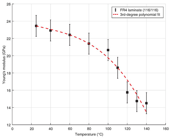 Temperature dependant Young’s modulus () for FR-4 laminate (116/116) [39].
