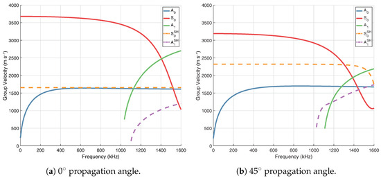 Dispersion curves are generated from orthotropic properties (20 °C) using The Dispersion Calculator [41], which utilises the stiffness matrix method (SMM). Figure 2 shows group velocity at propagation angles of 0° (Figure 2a) and 45° (Figure 2b). Shear-horizontal (SH) modes are denoted by dashed lines, however it should be noted that when propagation is not in the principal directions (0°/90°) these modes are coupled and not considered pure SH modes. In general, the use of Lamb waves for SHM is often limited to the frequency range below the cut-off frequency of the mode, in order to limit the number of propagating modes to only the fundamental symmetric () and anti-symmetric () modes. This helps to reduce the complexity of a received signal. Based on this consideration, excitation should occur at <1 MHz. As seen in Figure 3, operating at a frequency of 800 kHz with the mode will result in a wavelength of ∼4.5 mm, which is short enough to encourage reflection/scattering from the larger features of the board, namely the IC legs and small components. The orthotropic nature of the composite PCB material will result in a rhombus-like propagation pattern where wave velocity is fastest along the fibres [0°, 90°] and slowest at 45° with respect to fibre orientation, as shown in the energy velocity magnitude plot, Figure 4. A substantial reduction in amplitude should also be expected when the propagation path does not align with a fibre. This phenomenon can be attributed to the greater strength/stiffness in the fibre directions, which results in larger particle motion of guided waves [36].