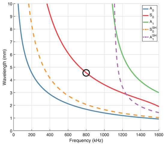 Wavelength of guided wave modes in 0.8 mm thick FR-4. The targeted frequency/wavelength of the mode is circled.