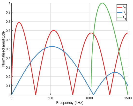Giurgiutiu [47] has shown that through careful selection of PWAS width and excitation frequency the response of a sensor can be tuned to selectively isolate a mode of interest using wavelength matching. Strain maxima will occur when PWAS length is an odd multiple of the half wavelength, and conversely minima will occur when PWAS length is an even multiple. Strain/frequency tuning curves can be generated from the relevant material properties/substrate thickness and used to select the most appropriate excitation frequency for targeting the mode of interest. For optimal single mode isolation, excitation should occur where the peak of one mode matches the rejection of the other. The effective length of the PWAS should also be considered, where the width of a real (or simulated) transducer should be larger than that used to generate tuning curves. As the length of the PWAS decreases, the percentage of non-effective area of the transducer increases. In the generation of tuning curves perfect bonding is assumed as that stress is only transferred to the structure at the end of the PWAS, which in reality is not the case [48]. For example, the effective length of a 5 mm wide PWAS is 4.5 mm.