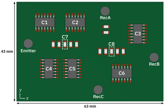 In order to reduce the number of mesh elements in the model, the copper traces connecting components are excluded. These features are small in comparison to the wavelength of the excitation signal, and they do not significantly affect the transmitted signal. Silkscreen and solder mask layers are also omitted. Simplifying the model in this way allows a large number of simulations to be carried out, in order to generate adequate training data for machine learning. The copper pads are treated as thin layers within both “Solid Mechanics” and “Heat Transfer in Solids” physics nodes, at a thickness of 35 A top-down view of the geometry can be seen in Figure 6.