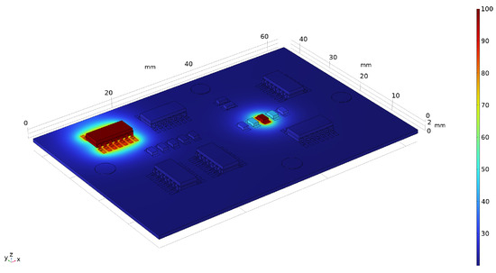 Simulations are carried out in two study steps. Firstly, a stationary study is used to solve for “Heat Transfer in Solids”, which allows for hotspots to be applied to components and features using the “Temperature” node. The thermal conductivity of FR-4 is poor (0.25 [50], which results in the thermal energy of hotspots being highly localised. Heat is mostly dissipated through the copper traces, vias, or dedicated heat sinks. A convective heat transfer coefficient of 15 is used for all boundaries. Thermal expansion is not considered, as the effect on wave propagation will be small over the considered temperature range, and a stationary study is used as temperature changes over the time period of wave propagation are negligible. Figure 7 shows an example of the heat transfer simulation when 100 °C hotspots are applied to components C1 and C8.