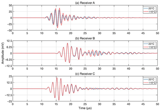 Time-domain signals at each receiver. Baseline signal (20 °C) vs. 110 °C hotspot at component 2 (C2).