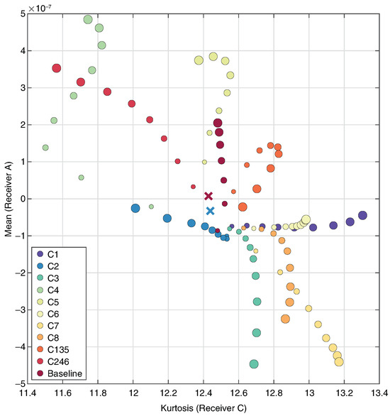 Neural network model predictions scatter plot. Receiver C Kurtosis (x) vs. Receiver A Peak Value (y). Hotspots at each component, 30–110 °C. Point size increases with hotspot temperature. Incorrect predictions denoted by ×.