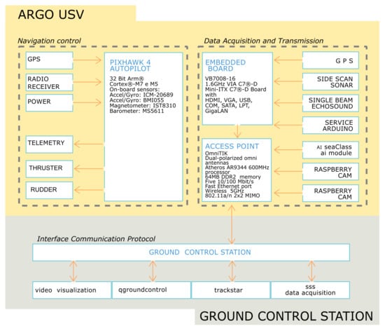 The management and data acquisition block is a proprietary iMTG Lab system and is based on an embedded PC, the VIA VB7008 (VIA Technologies, Inc. 940 Mission Ct, Fremont, CA 94539, USA), dedicated to the management and data acquisition of the main sensors (SBES, SSS). The VIA VB7008 is based on the processor 1.6 GHz VIA C7®-D and features 8 GB of RAM, a 500 GB hard disk and numerous I/O comm ports. The proprietary system installed on the VIA VB7008 Embedded PC guarantees the coexistence between the different sensors and subsystems required for the correct execution of the mission, integrating them into a single database and transmitting the data to the Ground Control Station (GCS) via LAN. For security reasons, the data generated by each sensor is also stored in bulk on a mass storage device onboard the USV.