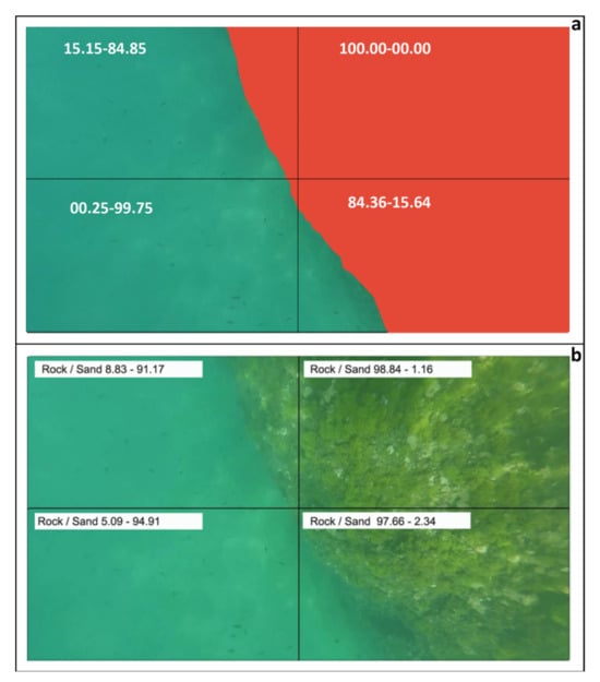 (a) Frame 1 extracted from the CLIP-A film and assessed by expert judgement to classify the areas according to rock class (red background) and sand class; (b) percentage of rock and sand classes detected by aiSeaClass module using Model 4.