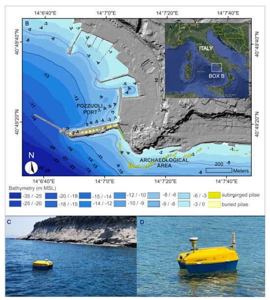 An integrated marine survey of the underwater Roman harbor of Puteoli along the Pozzuoli coast was carried out by the ARGO-USV (Figure 6), leading to the extensive mapping and characterization of the seabed and the 3D model reconstruction of some archaeological structures. This archaeological site was chosen as it is the best-preserved and most magnificent port work in the Gulf of Naples (Southern Italy), built during the Roman period (Sommella, 1980; Camodeca 1994).