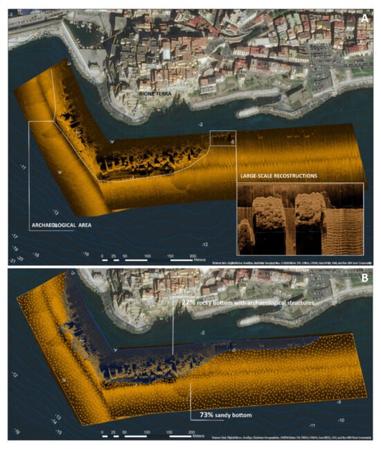 (A) SSS mapping of the underwater archaeological area; (B) sea bottom characterization from SSS signal analysis.