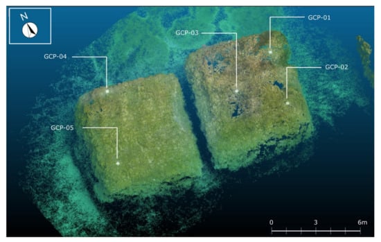 In particular, the small-scale mapping of the underwater area was obtained from the elaboration of SSS data, whose interpretations favored the classification of different types of seabed morphologies, discriminating between submerged landforms and archaeological structures like pilae (Figure 7). If 73% of the investigated area is characterized by a sandy bottom, 27% is a rocky bottom with archaeological structures. It is worth noting that almost all the pilae lie near the edge of a submerged terrace at a depth of 5 m BSL. Each pila has a squared base of 7 by 6 m and a height of 4.0 to 4.5 m, although there are some pilae with a base of 10 m. However, it was difficult to discriminate the bottom typology in the areas nearest the archaeological structures, due to the acoustic shadows created by the 4-meter elevated anthropic structures. For this reason, a large-scale analysis was applied to three pilae, probably aligned to compose a pier, in the eastern sector of the archaeological area, in order to both classify the sea bottom nearest the archaeological structures and obtain the 3D photogrammetric model of such structures (Figure 8). The coordinates of the Ground Control Points used to georeference the 3D photogrammetric model were determined by processing dual-frequency GNSS data (GPS + Glonass) collected in fast static mode from a receiver positioned on a 2.5-metre-high pole held vertically by an underwater operator. Using a reference station positioned at a distance of approximately 10 km, fixed solutions were determined for three GCPs and floating solutions for the other two. The standard deviations of the coordinates obtained with fixed solutions are approximately 2 cm, and those for floating solutions amount to 15 cm. The fixed solutions were inserted within the photogrammetric block as Ground Control Points, while the float solutions were used as CheckPoints. Downstream of the photogrammetric adjustment process, the residuals on the GCPs were approximately 6 cm in planimetry and 1 cm in altimetry, while for the CheckPoints these residuals were just under 20 cm in planimetry and 6 cm in altimetry.