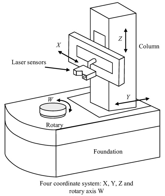 According to the measurement requirements of complex curved parts, the laser scanning four-coordinate measuring system, as shown in Figure 1, was the four-coordinate laser scanning measuring machine model used in this paper. The main body of the measuring machine was made up of three vertical axes, , and a rotary table W. Moreover, the laser sensor was fixed in the Z axis column and the part to be measured was fixed on the rotary table W. Three coordinate systems were established based on the configuration of the measuring machine system: the measuring machine motion coordinate system , the laser measurement coordinate system , and the workpiece coordinate system .