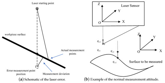 Figure 2a is a schematic diagram of the laser error. The laser error diagram reveals that the laser emission point is not directly beneath the actual measurement point during laser scanning. As the angle of inclination between the workpiece and the laser incident point increases, the measurement deviation, which is the distance between the error measurement point and the surface of the workpiece, also rises. Consequently, the measurement accuracy is highest when the incident laser is perpendicular to the workpiece surface. The normal measurement attitude schematic is shown in Figure 2b. The optimal location for measuring the laser sensor is the midpoint of the sensor range, and the midpoint of the range from the Z-axis column distance is set at m. Then, the ideal position of the point to be measured in the laser measurement coordinate system is , and the laser ray on the distance from the point of unit length of is . Set the part to be measured on a point that is to be measured , which is located in the workpiece coordinate system. Let , be the point to be measured , and let it be normal to the direction of the unit vector. Therefore, the point is in the direction that is normal to the point to be measured at a distance of the unit length from the point that can be obtained.