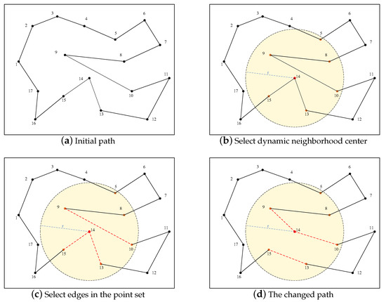 The domain selection was exemplified by 3-opt exchanges. (The example graph selects point 14 (red point) as the center point of the dynamic neighborhood, constructs the set of cities (all orange points) based on the radius r, and randomly selects the edges (red dashed lines) for the transformation, and the graph is d after the transformation).