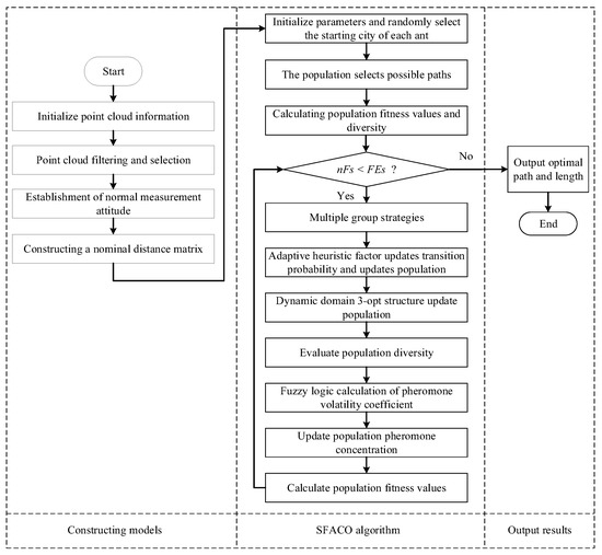 The SFACO algorithm proposed in this manuscript, as illustrated in Figure 5, was based on the above algorithmic improvements. This was shown, along with its application flowchart, in the laser scanning path planning.