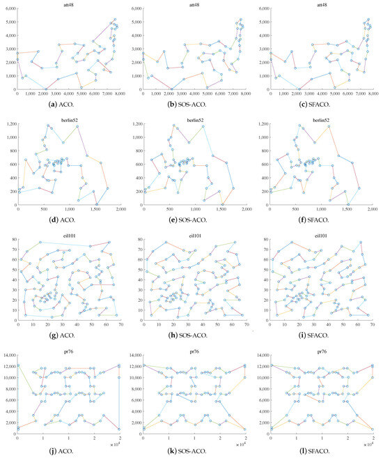 Figure 6 and Figure 7a,d,g,j show the optimal path result plots of the att48, berlin52, eil101, pr76, rat99, st70, u159, and tsp225 datasets when using the basic ACO algorithm, respectively. Figure 6 and Figure 7b,e,h,k are the optimal path result plots when using SOS-ACO algorithm. Figure 6 and Figure 7c,f,i,l are the optimal path result plots when using the SFACO algorithm. The results of the basic ACO algorithm to compute att48, berlin52, st70, pr76, eil101, u159, and tsp225 were 34,845.63596, 7933.379828, 727.319193508222, 121,710.560462624, 692.073972654823, 45,793.5195407362, 4246.602961659, respectively. Meanwhile, the results for the datasets that were computed using the SFACO algorithm were 33,522, 7542, 675, 108,159, 635, 42,080, and 3985. In the att48, berlin52, st70, and u159 datasets, the solutions computed by the SFACO approach were found to be the same as their theoretical optimal solutions, while the absolute errors between the SFACO approach when based on the eil101 and tsp225 datasets, as well as their corresponding theoretical global optimums, were 6 and 69, respectively. Furthermore, it can be observed from Figure 6 and Figure 7 that, for the att48 and berlin52 test datasets, the nodes were more uniformly geometrically distributed within their neighborhoods. As in Figure 6a–c, the distribution density in the upper right corner of the graph for the att48 dataset was larger than that of the nodes in the lower left corner. The distribution density of nodes in the center region of the image of the berlin52 dataset, as shown in Figure 6d–f, was larger than that of nodes in the surrounding region, and the relative distances between any two nodes in the neighborhood of all the nodes were approximately equal.