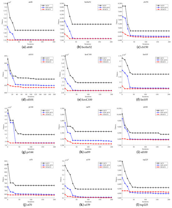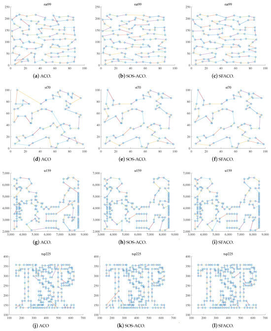 Figure 8 shows the comparison of the iterative convergence of the ACO, SOS-ACO, and SFACO approaches, from which it can be seen that the SFACO approach outperformed the basic ACO approach in terms of the convergence speed and convergence results in 12 of the datasets (i.e., att48, berlin52, ch150, eil101, kroC100, lin105, pr144, rat99, rd100, st70 u159, and tsp225).