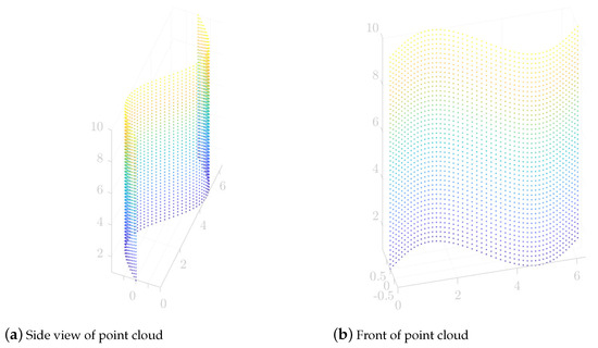 This part mainly discusses the laser scanning path planning process and results of the SFACO-based segmented surfaces. In this part of the experiment, the 3D point cloud data model of the surface was firstly established as shown in Figure 9, where Figure 9a,b are the side and front display effects of the surface, respectively. The surface point cloud model established in this paper had 2300 points distributed in 3D space, and all of the points were , , and .