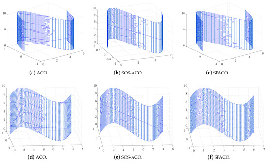 Figure 10 shows the optimal measured path diagram obtained by the ACO approach with SFACO calculation. Figure 10a,d show the optimal path diagram obtained by the ACO approach for path planning calculation. The path length calculated by the ACO approach was 441.4736, and it can be seen from the figure that there were many cluttered routes in the path diagram, which were obtained based on the calculation of the ACO approach. It was observed that the path planning did not reach the optimal state. Figure 10b,e show the optimal path diagram that was obtained by the SOS-ACO approach for the purpose of path planning calculation, and the path length was calculated as 407.1513. It can be seen that the SOS-ACO approach calculated the images more regularly than the ACO approach, but there are still some paths that were messy. Figure 10c,f show the optimal path diagram obtained by the SFACO approach for the purpose of path planning calculation, and the path length calculated was 405.997174156896. Figure 10c,f show the path result, and the scanning path was found to be more regular compared to the results shown in Figure 10a,d and Figure 10c,f. In addition, we can divide the whole surface from left to right into four regions, and it can be seen that they are different. Furthermore, it can be seen that the surface path planning scheme was not the same for the different curvatures, and there was less interspersing, which usually occurred when scanning from left to right. Combined with the optimal measurement posture of the laser probe, surfaces with the same curvature will be scanned centrally and then transferred to other surface areas. Therefore, the scanning paths obtained by the SFACO approach were very consistent with the optimal measurement attitude.