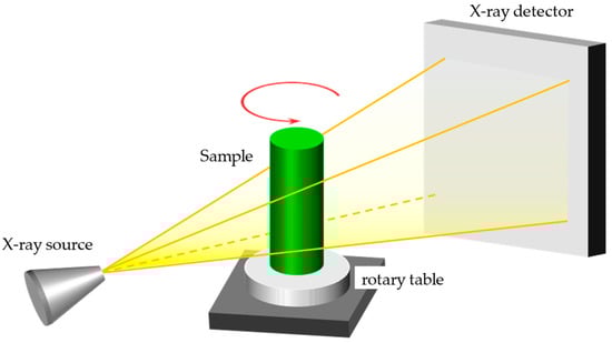 A typical XCT system consists of an X-ray source, a mechanical scanning motion system, a radiation detector system, and a computer system to analyze the received data. Typical cone-beam computed tomography (CBCT) is shown in Figure 1. During operation, the X-ray tube emits an X-ray beam. As this beam penetrates an object, the interactions between the X-rays and the material decrease the intensity of the X-rays in the direction of incidence. The X-ray detector records the degree of attenuation of the X-ray beam as it passes through the object. The intensity value of each pixel in the detector is a function of the attenuation coefficient (µ (s)) and the path of the X-rays, and the variation in attenuation intensity adheres to the Beer–Lambert law []: