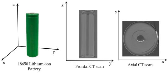 The structure of cylindrical lithium-ion batteries mainly consists of two components. The first is the jelly roll, which is created by winding a composite material made up of a cathode, an anode, and two separators []. The second is the cell housing, constructed from a can and a cap. The larger the atomic number of the general element, the greater the X-ray attenuation and gray value []. The anode current collector in lithium-ion batteries is typically made from copper foil, with nickel often used for the negative electrode plate. The primary materials for the cathode current collector are usually nickel and aluminum, while the anode material is typically carbon. Elements with higher atomic numbers, such as those in the anode current collector, have higher X-ray attenuation and grayscale values, making them appear white in CT images. In contrast, elements with lower atomic numbers, like those in the anode material, present lower grayscale values and appear black in CT images []. XCT scanning images of a cylindrical lithium-ion battery are shown in Figure 2.