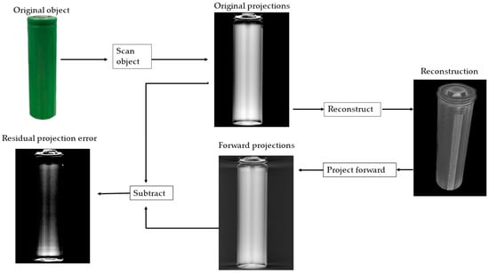 In tomographic 3D reconstruction, the set rotational angle interval of the rotary table is typically multiplied by the number of rotations to determine the projection angle. However, in practical use, the rotary table has rotational errors, and since there is no angle monitoring device, we cannot know the actual degree of rotation of the rotary table. There is no need to purchase a high-precision rotary table. By installing suitable angle sensors on the rotary table, we can obtain the real-time rotation data of the rotary table and thus adjust the original projection angle, greatly improving the accuracy of the projection angle. Due to the widespread application of 18650 lithium-ion batteries, many researchers have chosen them as their subject of study [,]. However, the projections in all directions of cylindrical lithium-ion batteries are similar, making it difficult to spot errors in the projection angle. Therefore, cylindrical lithium-ion batteries are selected for experiments. For the study of XCT imaging quality, people often establish virtual projection models on a computer for simulation analysis. However, simulations cannot adequately reflect the actual XCT scanning situation for systems with complicated internal structures like lithium-ion batteries. Therefore, experiments use real projection data from cylindrical lithium-ion batteries. In experiments, the total variable [,,] and residual projection errors [] are used as indexes of the reconstructive image quality.