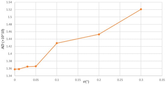 Figure 7 shows the curve of the residual projection error as the error σ changes. The trend is similar to Figure 6, with the change not being too noticeable when σ is less than 0.05°. However, it becomes more significant when σ is greater than 0.05°.