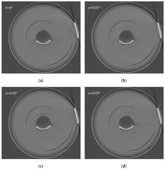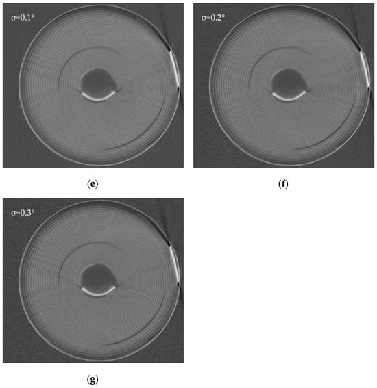 Table 1 shows the TV and AD values at different angle errors σ, which, respectively, represent the quantity of image artifacts and the degree of distortion. It can be observed that as the angle error σ increases, the TV value gradually increases. This rise in the TV value indicates an increase in image noise and artifacts, leading to a gradual deterioration in image quality. Notably, when the angle error σ is small, the increase in the TV value is relatively modest. However, when the error angle σ exceeds 0.1°, the TV value increases by 3.4%, and the growth in the TV value starts to become notable. Even further, when the error angle σ reaches 0.3°, the TV value has already grown by 11.6% compared to its initial state. The trend in AD values is similar to the trend in TV values, gradually increasing with the increase in angle error σ, which indicates that the accuracy of the image gradually decreases and becomes distorted. When the error angle σ exceeds 0.1°, the TV value increases by 5.2%, and when the error angle σ reaches 0.3°, the AD value has increased by 12.0% from its initial state.